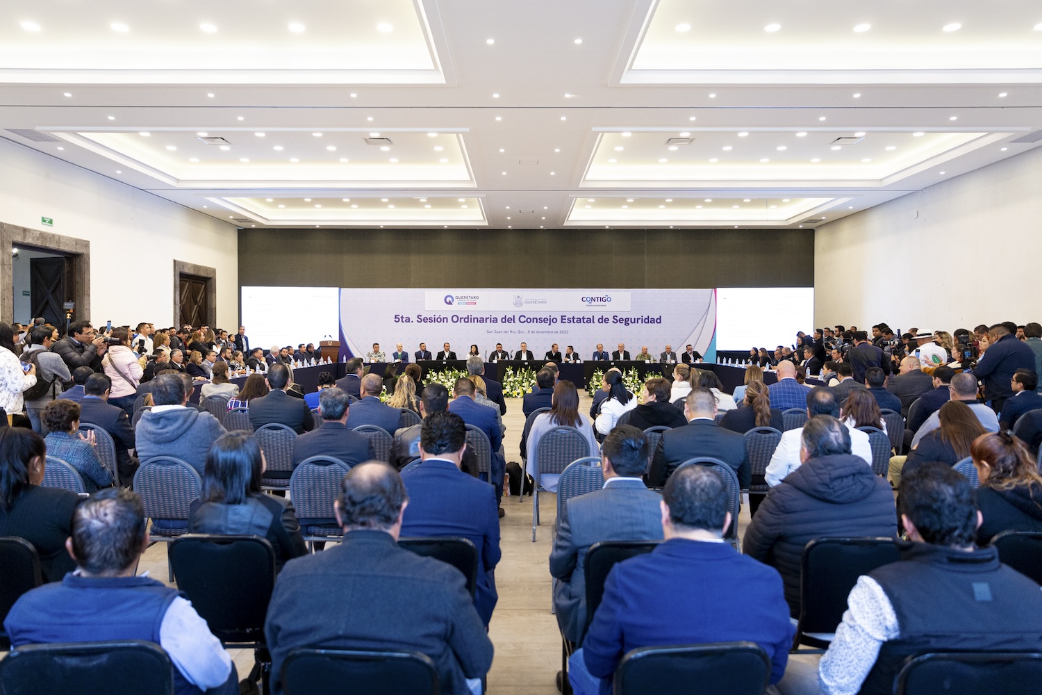 En esta Quinta Sesión los titulares de las instituciones y áreas de seguridad del estado hicieron acopio de información del resto de las autoridades del sistema estatal de seguridad y expusieron los resultados. A su vez, el presidente municipal de San Juan del Río, Roberto Carlos Cabrera Valencia, presentó el informe de las acciones del Sistema de Justicia Cívica que a la fecha han aplicado los alcaldes de los municipios de Corregidora, El Marqués, Huimilpan y Querétaro.