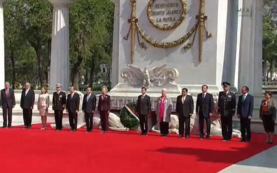 La ceremonia inició con la colocación de una ofrenda floral en el monumento del Benemérito de las Américas ubicado en Palacio Nacional, a la cual el mandatario fue acompañado por los secretarios de Gobernación, Miguel Ángel Osorio Chong; de Relaciones Exteriores, Claudia Ruiz Massieu Salinas, y de Salud, José Narro Robles.