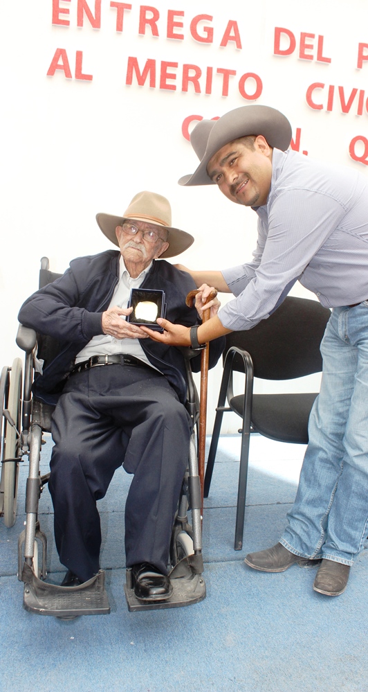 El presidente de Colón, Alejandro Arteaga Cabrera, entregó la medalla al Mérito Cívico 2015 a Don Primitivo Gutiérrez Rojas, de 94 años de edad, por su servicio en la administración pública a favor de los colonenses así como su cercanía con los habitantes del municipio.
