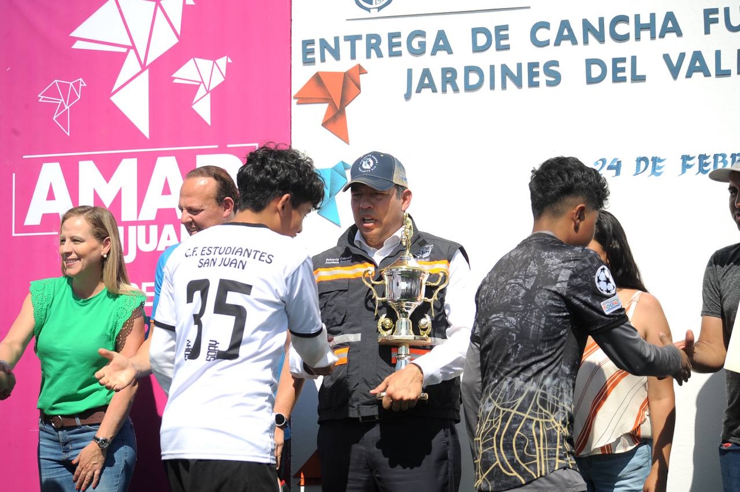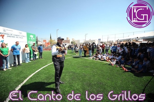 Con una inversión de 2 millones 99 mil 802.59 pesos, el presidente municipal, Roberto Cabrera Valencia, encabezó la entrega de la cancha de futbol 7 en la colonia Jardines del Valle II, obra que beneficiará a un total de 200 habitantes, quienes contarán con espacios para realizar actividades deportivas.