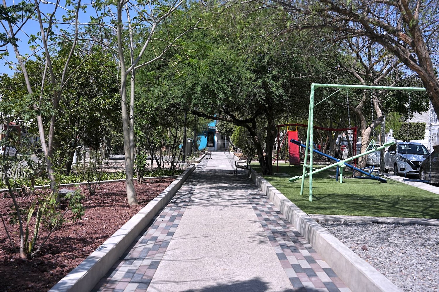 También se rehabilitó el área infantil con pasto sintético, se renovaron las áreas verdes, se reubicaron plantas existentes y se colocaron nuevas texturas. Además, se plantaron 10 árboles, se rehabilitó el área de nicho, se pintaron las bancas y se eliminó el grafiti en la Plaza del Atrio de la Iglesia Picos.