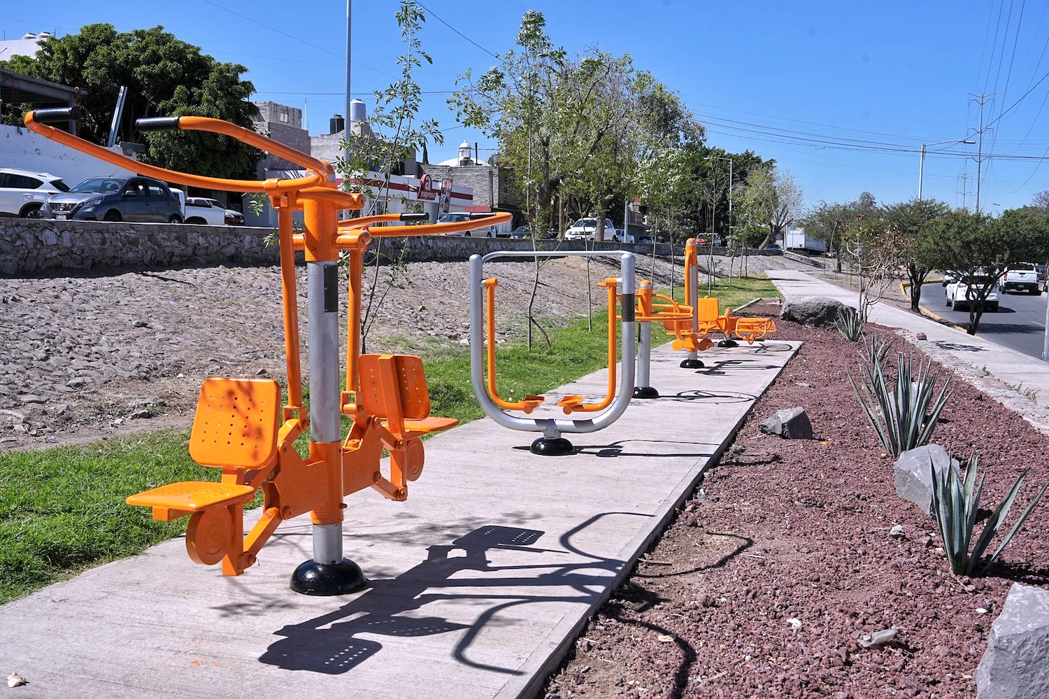 Para la rehabilitación y mantenimiento de los aparatos de ejercicio al aire libre se construyó una plancha de concreto de 55 metro cuadrados; para la rehabilitación del camellón en la Avenida 4 se realizó la limpieza de canchas y perfilado de banquetas y taludes; se reconstruyó la banqueta, el andador y murete en escalera; se realizó el borrado de grafiti, pintado de jardineras y guarniciones.