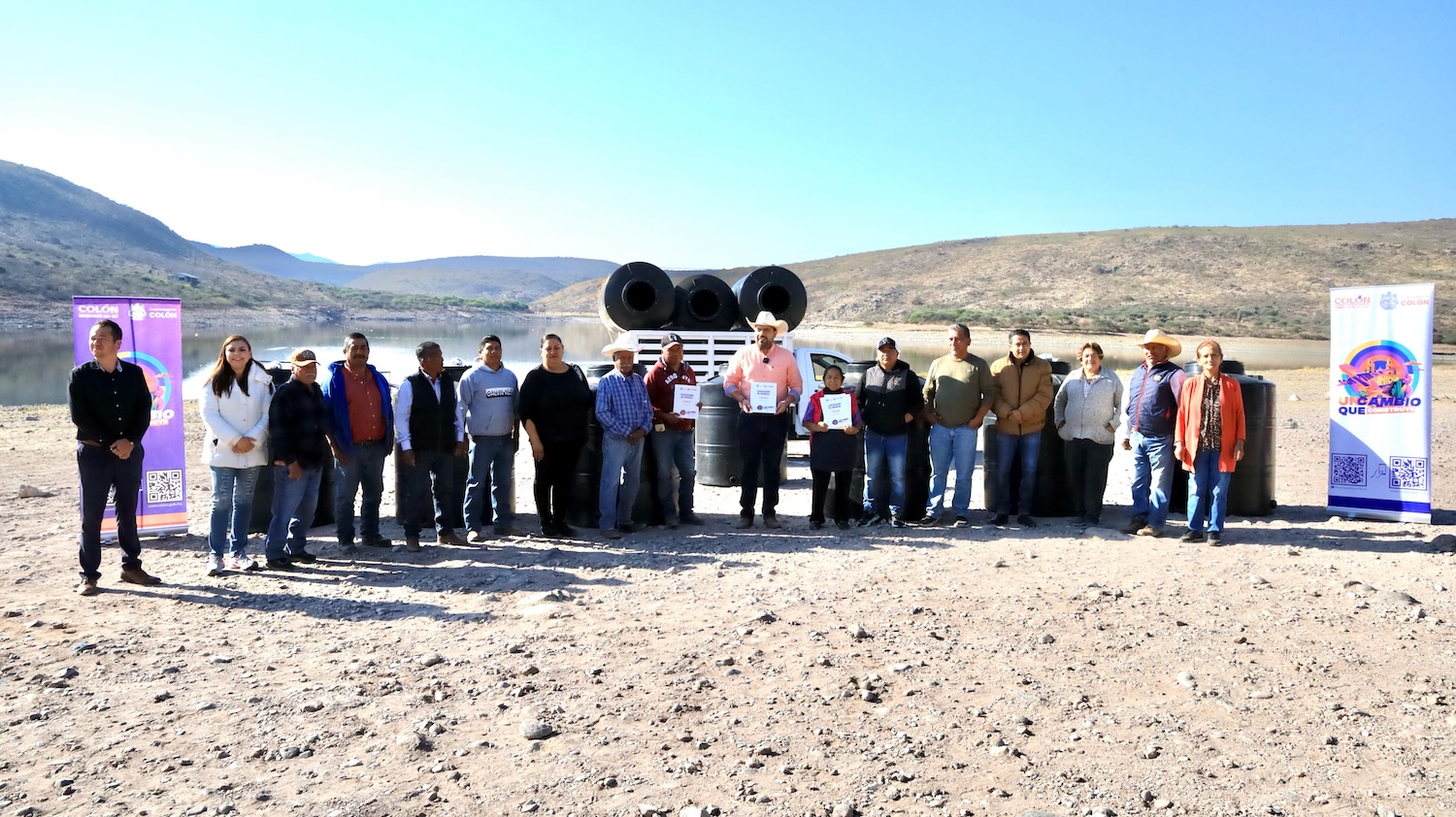 El presidente municipal, Gaspar Trueba Moncada, entregó 14 depósitos para agua potable a integrantes de la Asociación de Pescadores de la Presa La Soledad.