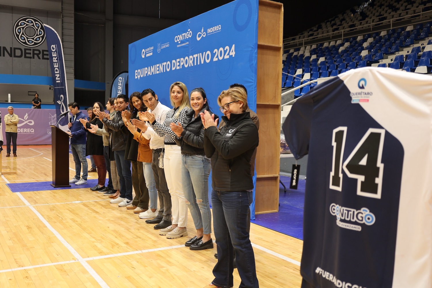La directora del Instituto del Deporte y la Recreación del Estado de Querétaro (Indereq), Iridia Salazar Blanco, encabezó la entrega simbólica de uniformes para casi 23 mil deportistas que juegan en las ligas municipales de basquetbol, futbol y voleibol en todo el estado.