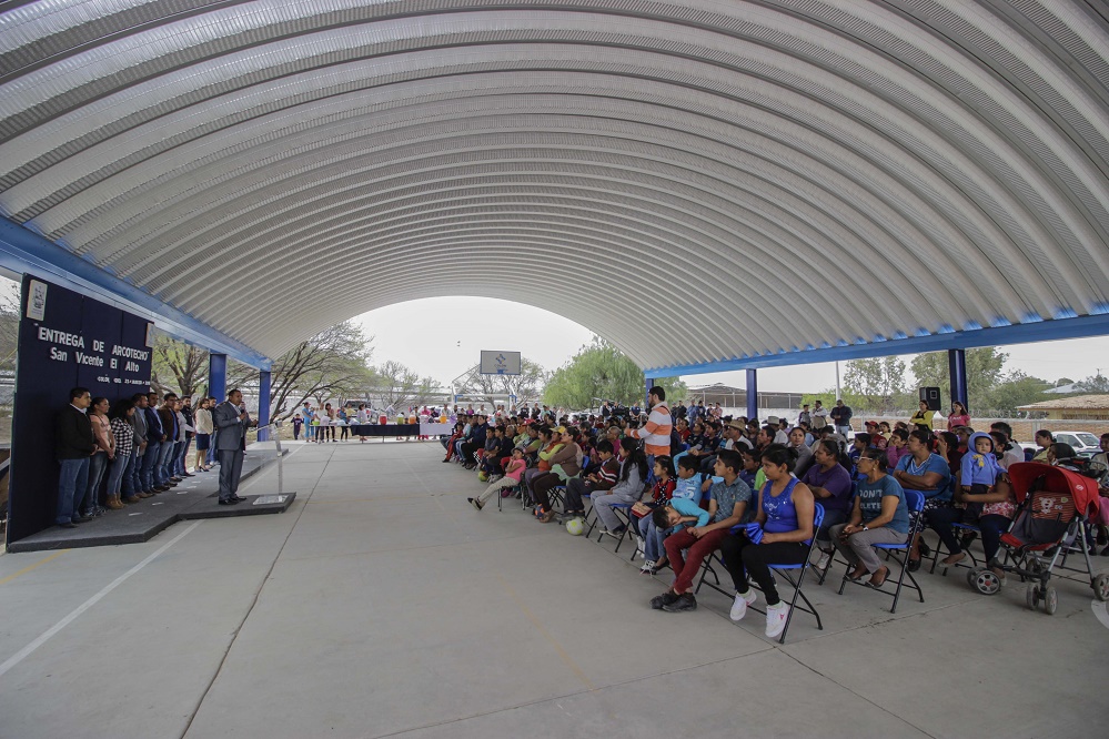 Con el objetivo de mejorar la calidad de vida de los colonenses, José Alejandro Ochoa Valencia acompañado de su esposa la Sra. Mary Hernández de Ochoa, Presidenta del Sistema Municipal DIF, entregó una cubierta a base de arcotecho en la cancha de usos múltiples de la comunidad de San Vicente el Alto con una inversión municipal de 1 millón 38 mil pesos.