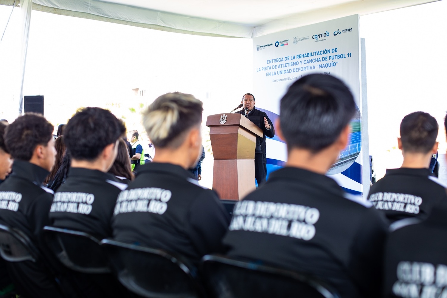 El gobernador, Mauricio Kuri González, presidió la entrega de la rehabilitación de la pista de atletismo y cancha de futbol 11 en la Unidad Deportiva Maquío, en el municipio de San Juan del Río, proyecto que forma parte del programa “Contigo más y mejores espacios deportivos 2024”, en el que se invirtieron recursos superiores a los cuatro millones de pesos para beneficio de más de tres mil 700 habitantes de la comunidad.