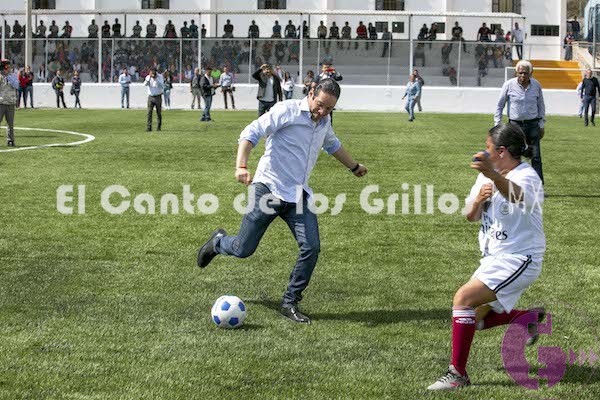 Durante la entrega, el gobernador del estado encabezó un recorrido por la cancha de futbol soccer acompañado del exfutbolista Tito Villa, de los titulares de Sedesoq y Sejuve, y representantes de las ligas del municipio de Tolimán.