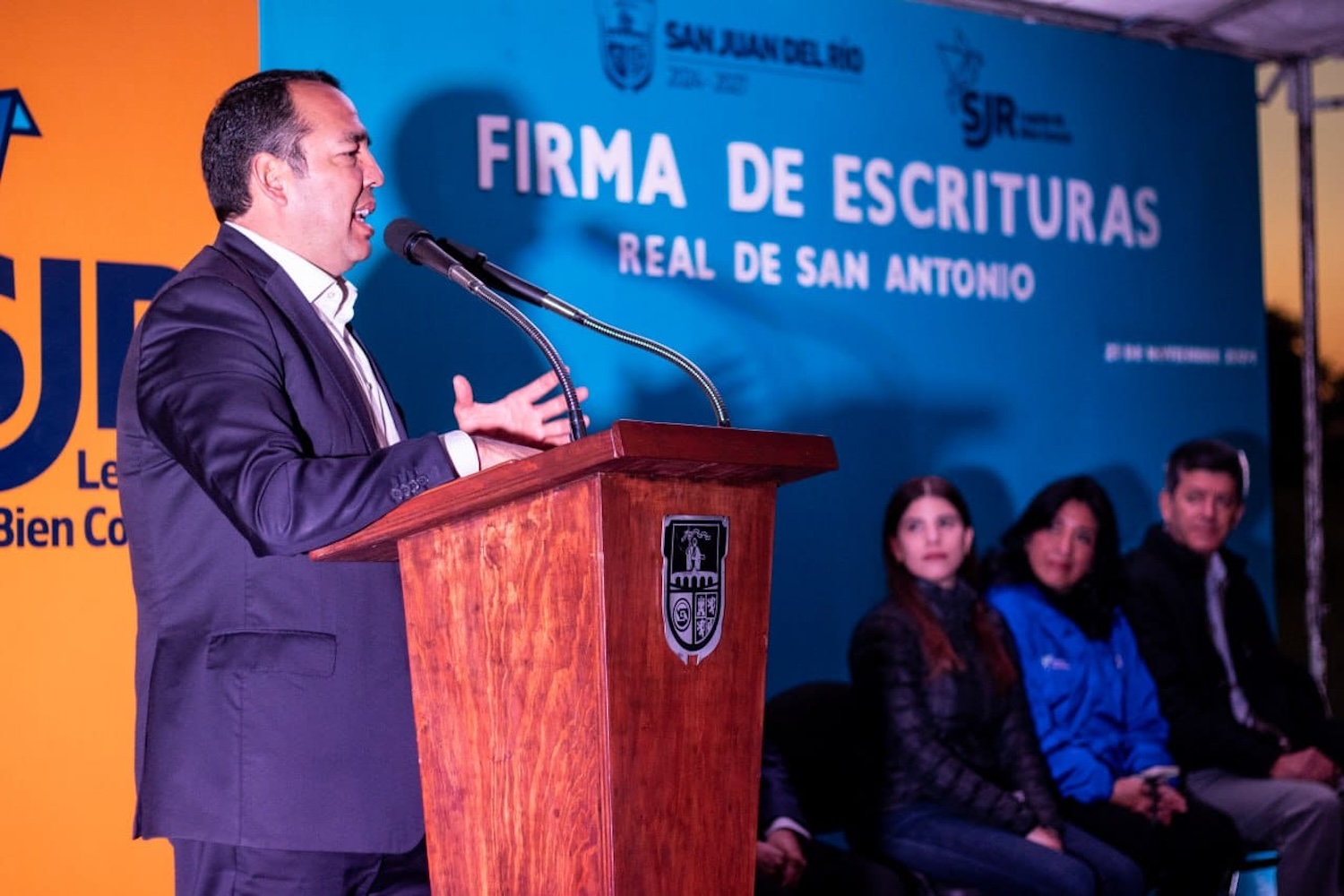 Para brindar certeza jurídica a las familias sanjuanenses sobre sus propiedades, el presidente municipal de San Juan del Río, Roberto Cabrera Valencia, encabezó la firma y entrega de 38 escrituras para los habitantes de Real de San Antonio, donde destacó que, con estas acciones el municipio avanza en la construcción de un San Juan donde cada familia pueda ver el futuro con confianza.
