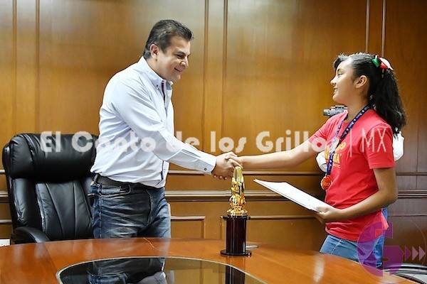 “Quiero felicitarte y felicitar a tus padres. Se dice una cosa fácil, pero ganar un campeonato, ya sea municipal, estatal, nacional, pero ya un campeonato mundial, requiere de disciplina, compromiso y muchos sacrificios. A nosotros nos llena de orgullo, eres de una comunidad que se le tiene mucho aprecio, que es La Fuente, y de una escuela que ha demostrado estos últimos años mucha calidad en su educación”, dijo Mejía.