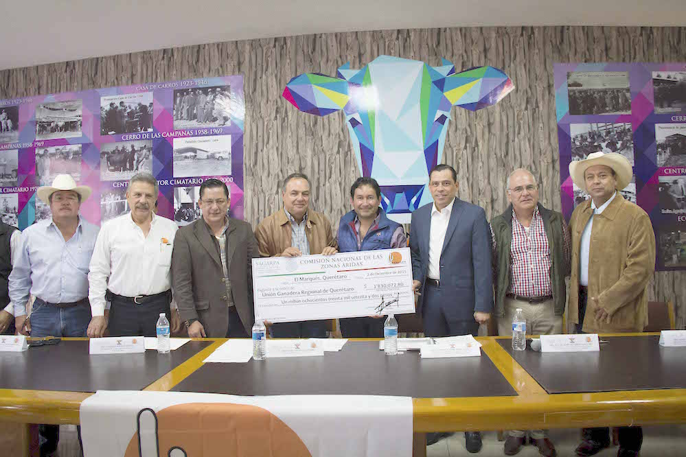 El director general de la Comisión Nacional de Zonas Áridas, Abraham Cepeda Izaguirre, entregó ayer al Tesorero de la Unión Ganadera Regional de Querétaro, José Luis Cervantes Lara, recursos por un millón 830 mil 72 pesos, de los 3 millones, 348 mil pesos que serán en total del año 2015, para la rehabilitación de 3 mil hectáreas de predios del desierto y el semidesierto queretano.