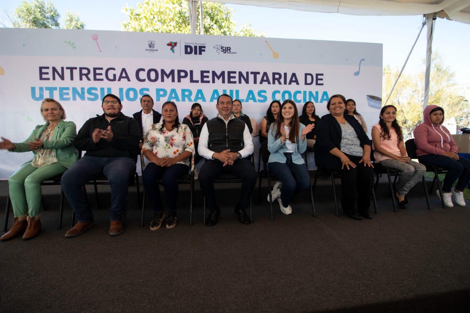Para fortalecer la labor que se realiza en las aulas cocina, la presidenta del Sistema Municipal para el Desarrollo Integral de la Familia (SEDIF), Georgina Sánchez Barrios, en equipo con el presidente municipal de san Juan del Río, Roberto Cabrera Valencia, encabezaron la entrega complementaria de utensilios para aulas cocina.