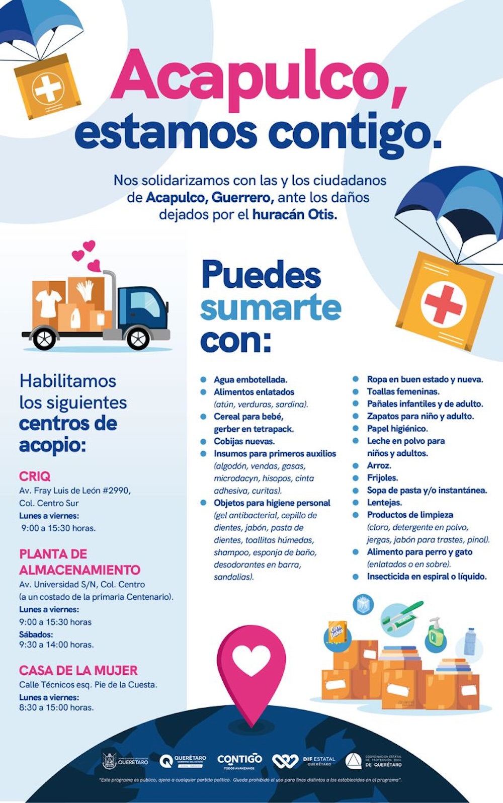 Asimismo, el director general del Sistema Estatal DIF, Óscar Gómez Niembro, anunció la apertura de tres centros de acopio: en el Centro de Rehabilitación Integral de Querétaro (CRIQ); la Casa de la Mujer, de Pie de la Cuesta, y la Planta de Almacenamiento ubicada en avenida Universidad, donde a partir del viernes 27 de octubre los ciudadanos pueden llevar sus donativos de 9:00 a 15:30 horas.