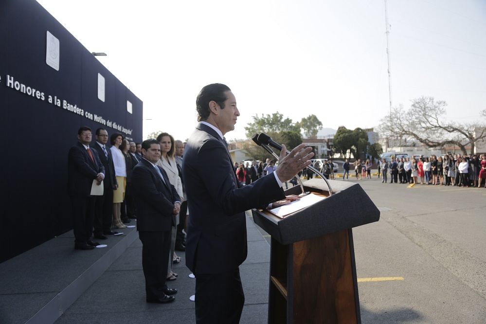 El Gobernador del Estado de Querétaro, Francisco Domínguez Servién, encabezó la ceremonia de honores a la bandera con motivo del día del Juzgador, acto cívico que tuvo lugar en la plaza principal de Centro de Justicia.
