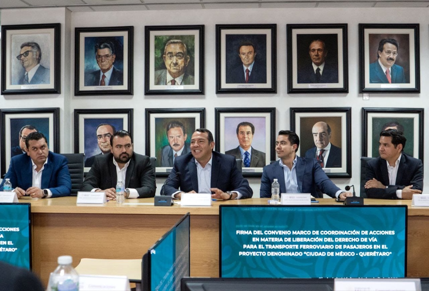 En las instalaciones de la Secretaría de Infraestructura, Comunicaciones y Transportes (SICT), ubicadas en la alcaldía de Coyoacán, en la Ciudad de México, el presidente municipal de San Juan del Río, Roberto Cabrera Valencia, firmó el “Convenio Marco de Coordinación de Acciones en Materia de Liberación del Derecho de Vía para el Transporte Ferroviario de Pasajeros en el Proyecto Denominado ‘Ciudad de México-Querétaro’”.