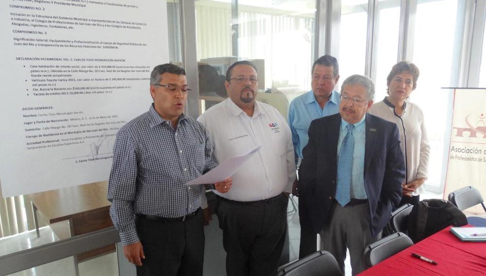 El candidato del Partido Encuentro Social (PES) de San Juan del Río a la presidencia municipal, Carlos Mondragón Barrón, se reunió con miembros integrantes del Colegio de Profesionistas y firmó ante notario público sus principales compromisos de campaña, para llevarlos a cabo en caso de llegar a encabezar el gobierno municipal.