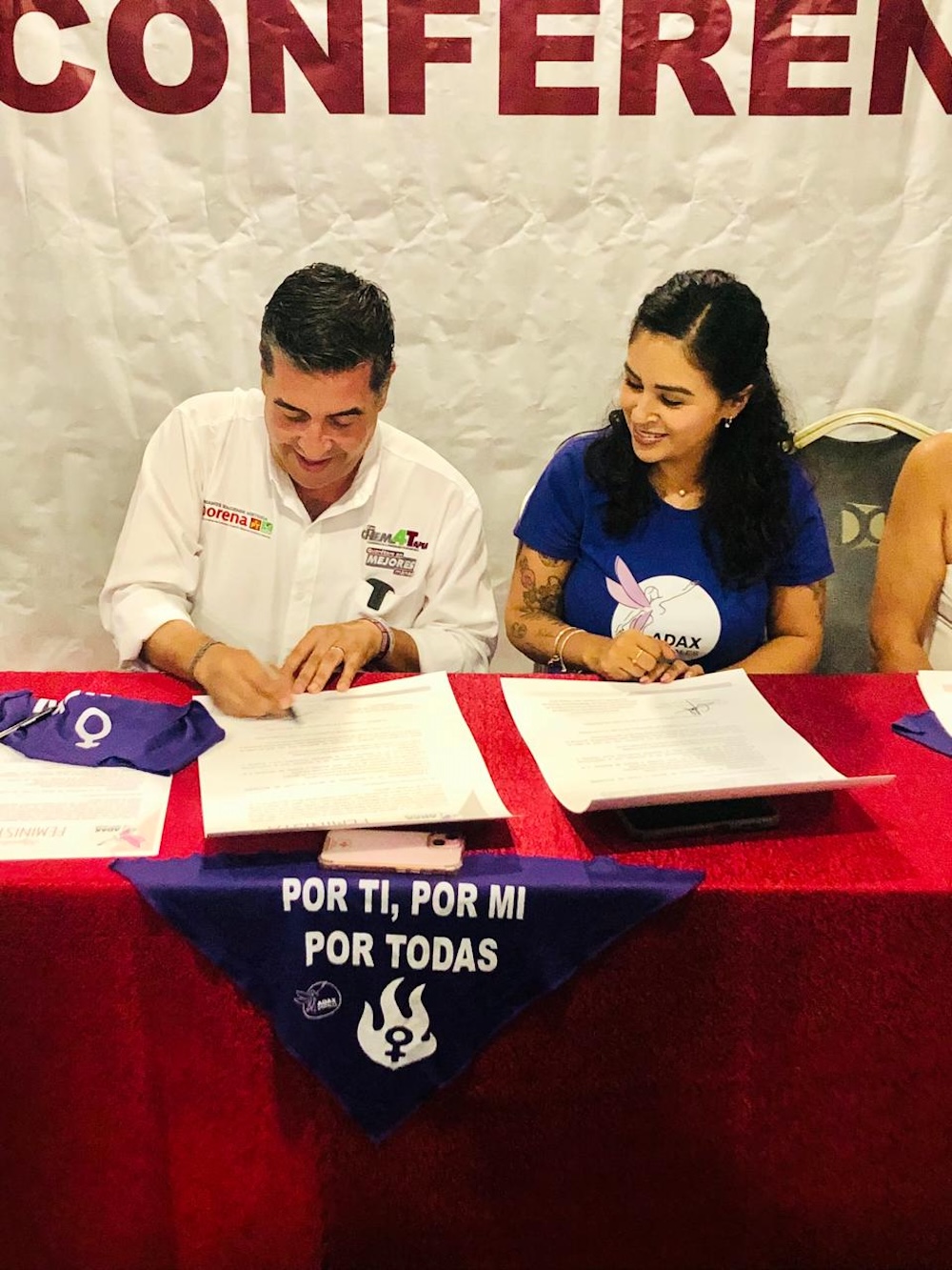 Con el objeto de trabajar de manera conjunta entre autoridades municipales, el poder legislativo y la sociedad civil en torno a transversalizar políticas públicas y leyes para las mujeres y perspectiva de género, el candidato de Morena Partido Verde y PT a la alcaldía de Querétaro, Chema Tapia, los candidato al congreso local, Alicia Colchado, Claudia Gayou y Ulises Gómez de la Rosa, firmaron la Agenda Feminista con la asociación civil Adax Digitales.