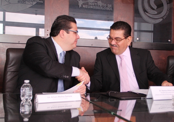 En el campus Juriquilla de la Universidad Nacional Autónoma de México (UNAM), el Presidente del Consejo de Dirección UNAM Juriquilla y Director del Centro de Física Aplicada y Tecnología Avanzada, Ramiro Pérez Campos y el Director General del Colegio de Bachilleres del Estado de Querétaro (COBAQ), Arturo Molina Zamora, firmaron convenio de colaboración con vigencia de 3 años, mediante el cual se realizarán actividades conjuntas de carácter académico, científico y cultural en beneficio de la comunidad estudiantil de ambas partes.