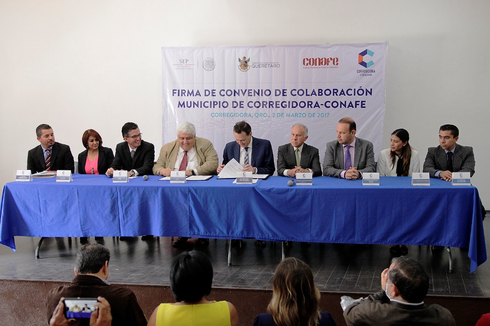 Mauricio Kuri González, presidente municipal de Corregidora, encabezó la firma del convenio de colaboración entre la demarcación y el Consejo Nacional de Fomento Educativo (CONAFE).