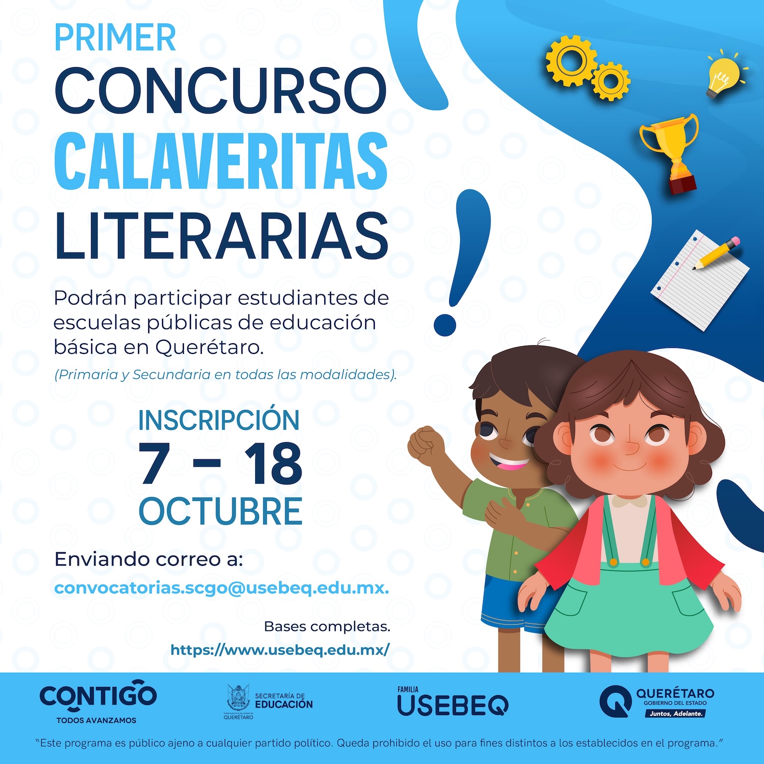 Con el propósito de fomentar y preservar las tradiciones culturales mexicanas en el marco del Día de Muertos, la Unidad de Servicios para la Educación Básica en el Estado de Querétaro (USEBEQ), convoca a los 306 mil estudiantes de las mil 89 escuelas primarias y 378 secundarias públicas, en todas sus modalidades en la entidad, a participar en el primer concurso de calaveritas literarias.