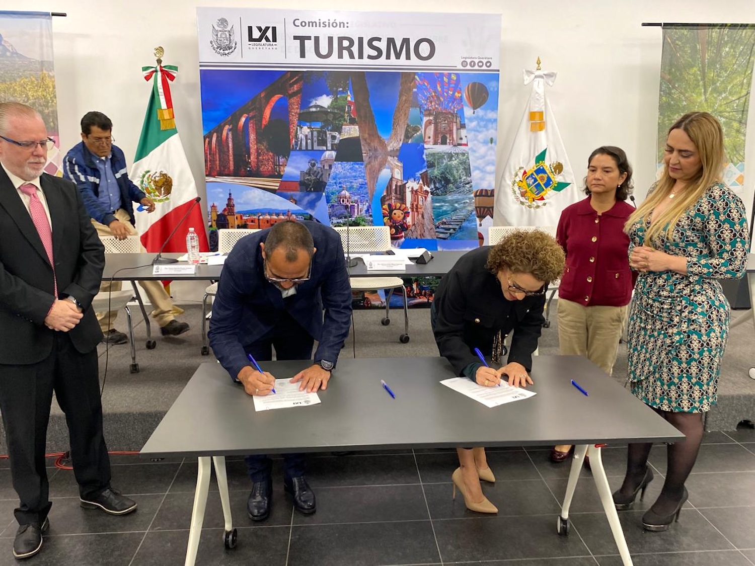Al inicio de la Comisión de Turismo de la LXI Legislatura local que preside la diputada Adriana Elisa Meza Argaluza y la conforman las legisladoras Perla Patricia Flores Suárez y María Blanca Flor Benítez, se firmó un convenio de colaboración con la Cámara Nacional de Comercio y Servicios y Turismo (Canaco Servytur) de San Juan del Río, evento en el que estuvieron presentes, los diputados Teresita Calzada Rovirosa, Mauricio Cárdenas Palacios y Paul Ospital Carrera; el director de Promoción Turística de la secretaría estatal del ramo, Rodrigo Ibarra Lozano; así como diputados federales, presidentes de cámaras de comercio, regidores, asociaciones civiles y público en general.