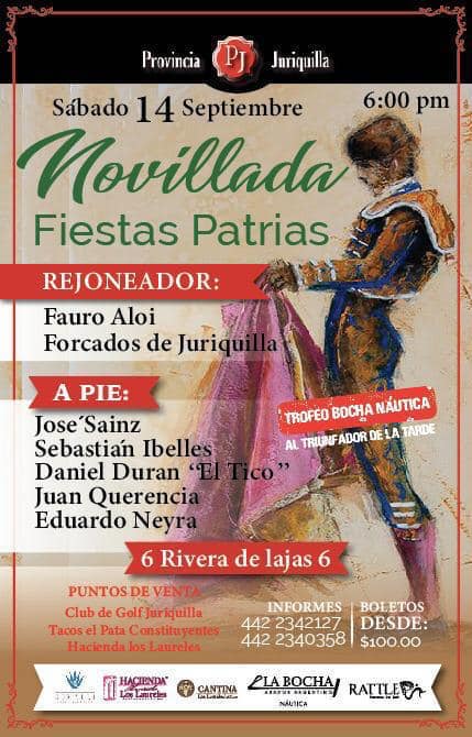 En apoyo a los novilleros, Torreslanda Urquiza ha anunciado una novillada este 14 de septiembre. en la cual estará abriendo plaza el rejoneador Fauro Aloi acompañado de los Forcados de Juriquilla, y a pie, los novilleros José Sáinz, Sebastiçan Ibelles, Daniel Durán “El tico”, Juan Querencia y Eduardo Neyra con novillos toros de Rivera de Lajas.
