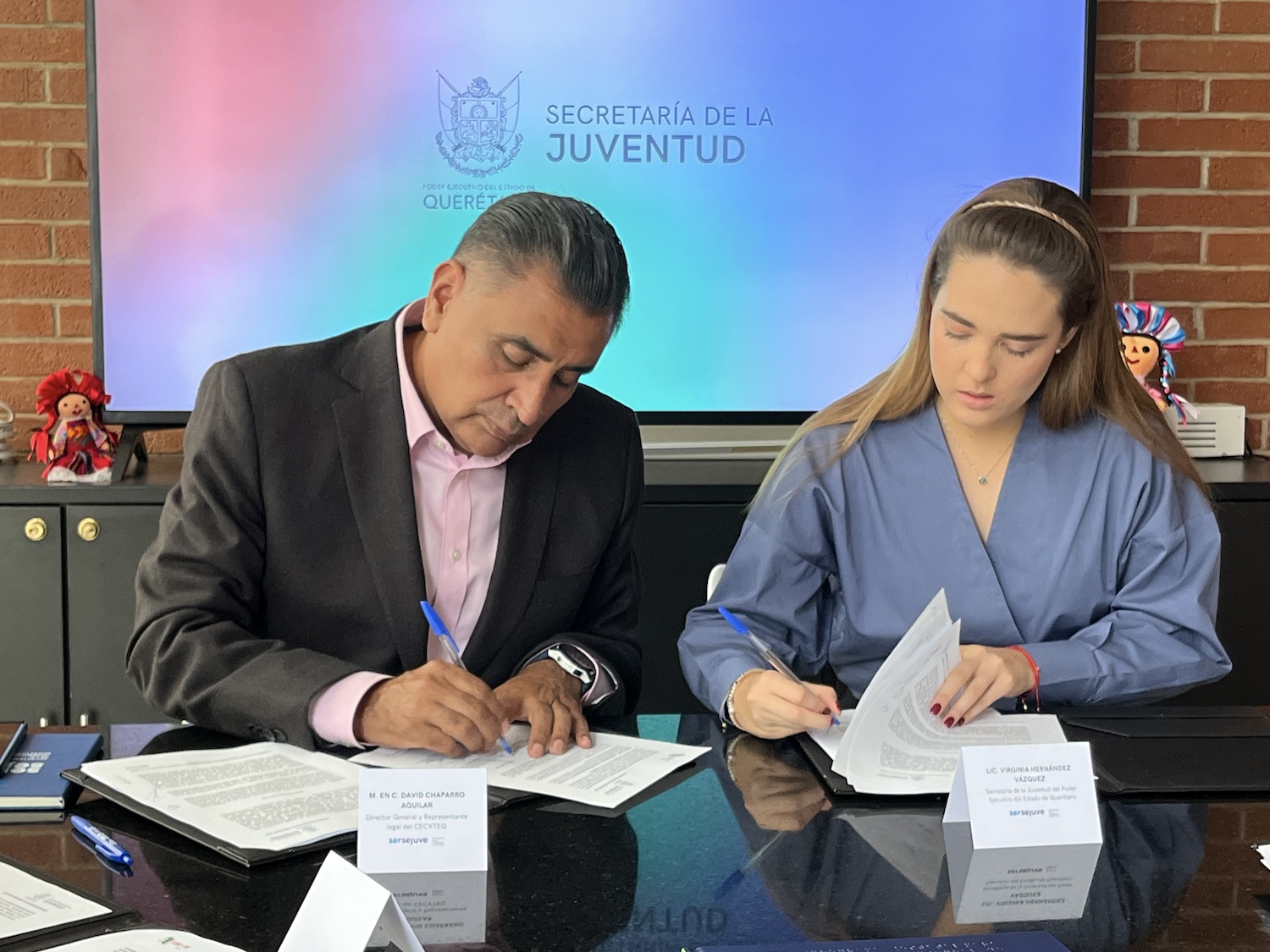 El director general del Colegio de Estudios Científicos y Tecnológicos del Estado de Querétaro (Cecyteq), David Chaparro Aguilar, y la titular de la Secretaría de la Juventud (Sejuve), Virginia Hernández Vázquez, firmaron un convenio para el impulso en conjunto de la Educación Dual.