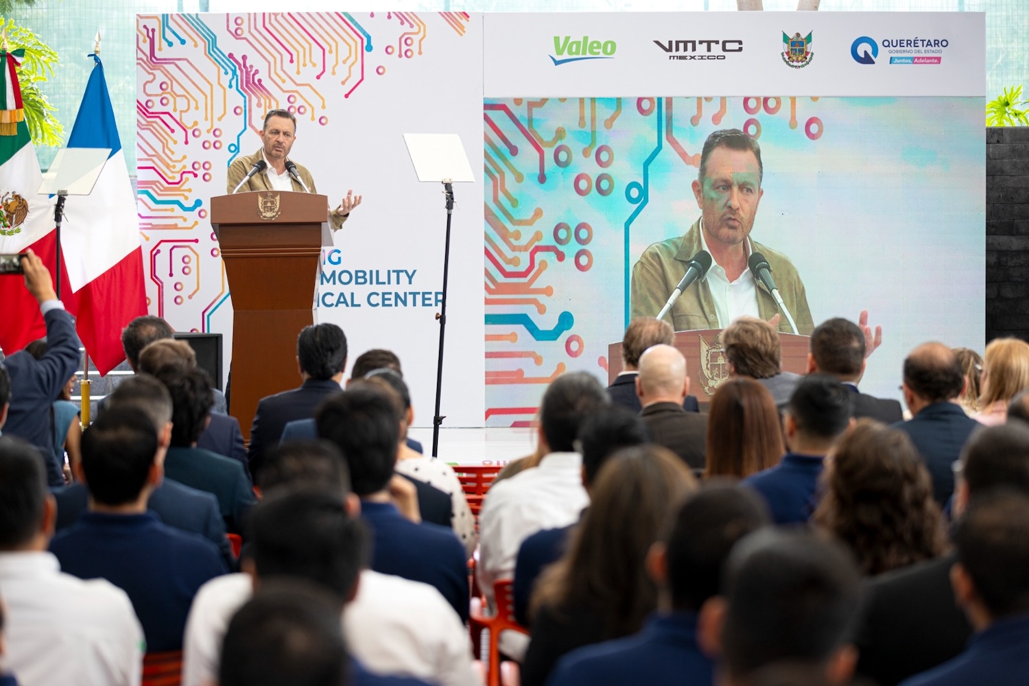 Durante su mensaje, el mandatario estatal celebró la apertura de la nueva división del Centro de Desarrollo Técnico de la compañía que opera en Querétaro, mismo que desarrollará tecnología en electromovilidad y que desde la entidad brindará soporte a todos los Grupos de Negocios de Valeo en Norteamérica.