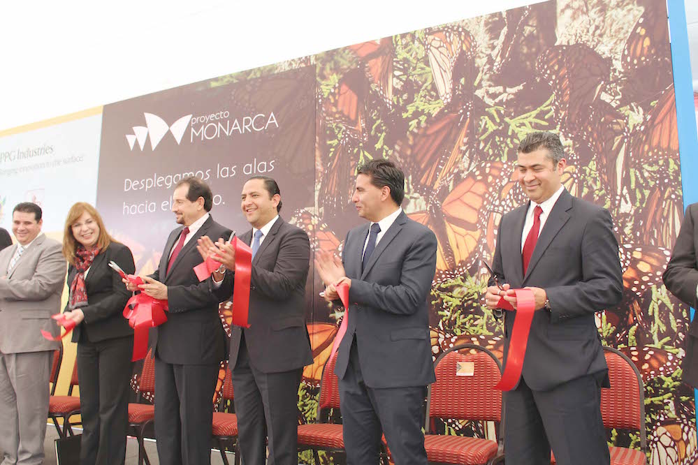El presidente municipal de San Juan del Río, Fabián Pineda Morales, y el gobernador del estado Jorge López Portillo Tostado, encabezaron la ceremonia de inauguración del Proyecto Monarca de PPG Industries de México, en el que se invirtieron 27 millones de dólares y generó 115 empleos formales.