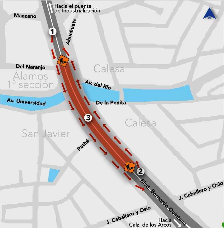A partir del miércoles 20 de abril se desviará el tránsito vehicular de los carriles centrales a los laterales, desde avenida Industrialización hasta Calzada de los Arcos, ya que los carriles centrales serán el espacio para alojar la cimentación.
