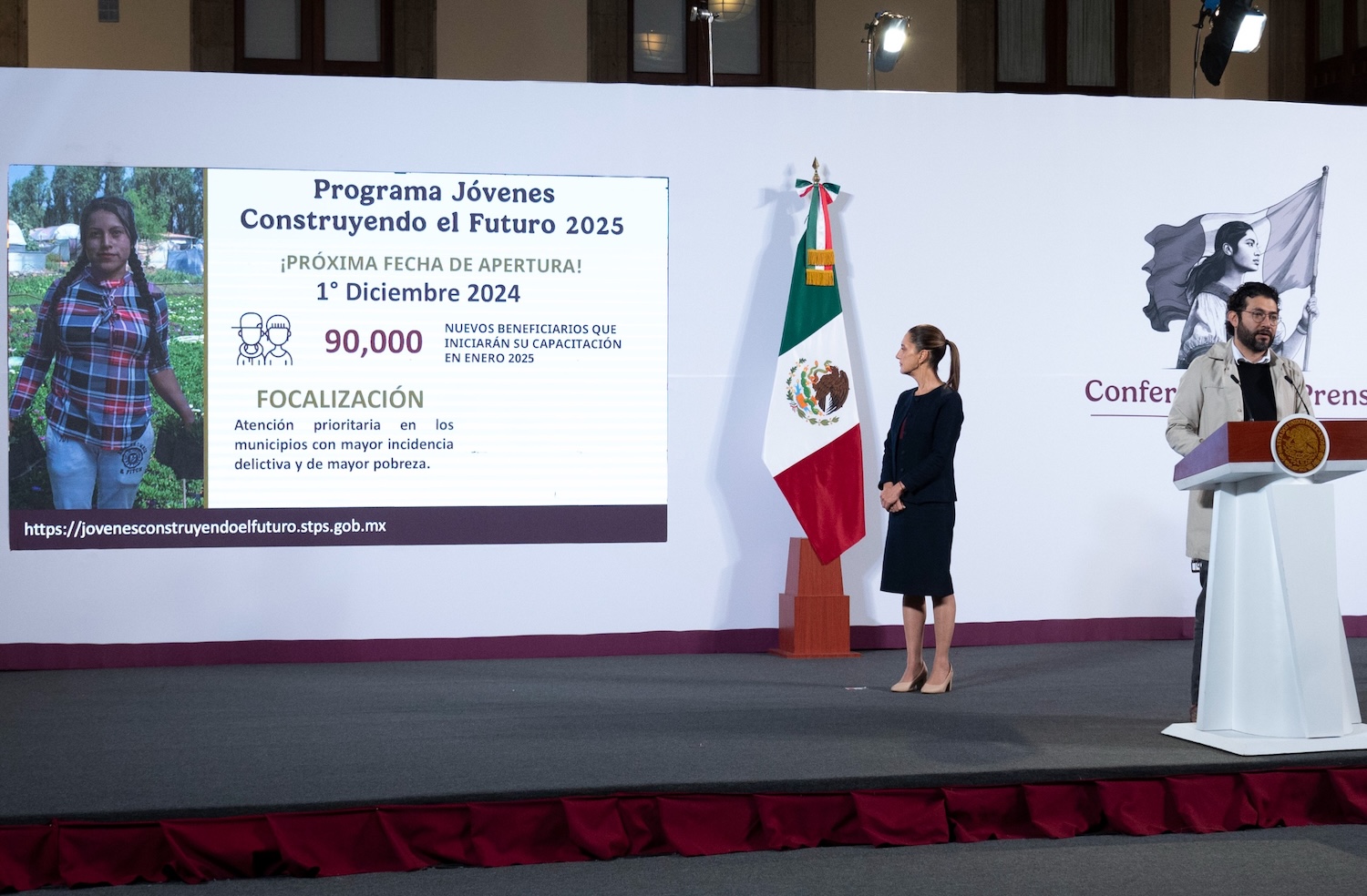 Informó que, desde su creación, Jóvenes Construyendo el Futuro ha beneficiado a cerca de 3 millones de personas entre 18 y 29 años –60 por ciento mujeres y 40 por ciento hombres– y se han invertido 135 mil millones de pesos de 2019 a 2024, lo que ha permitido avanzar en el acceso al derecho al trabajo.