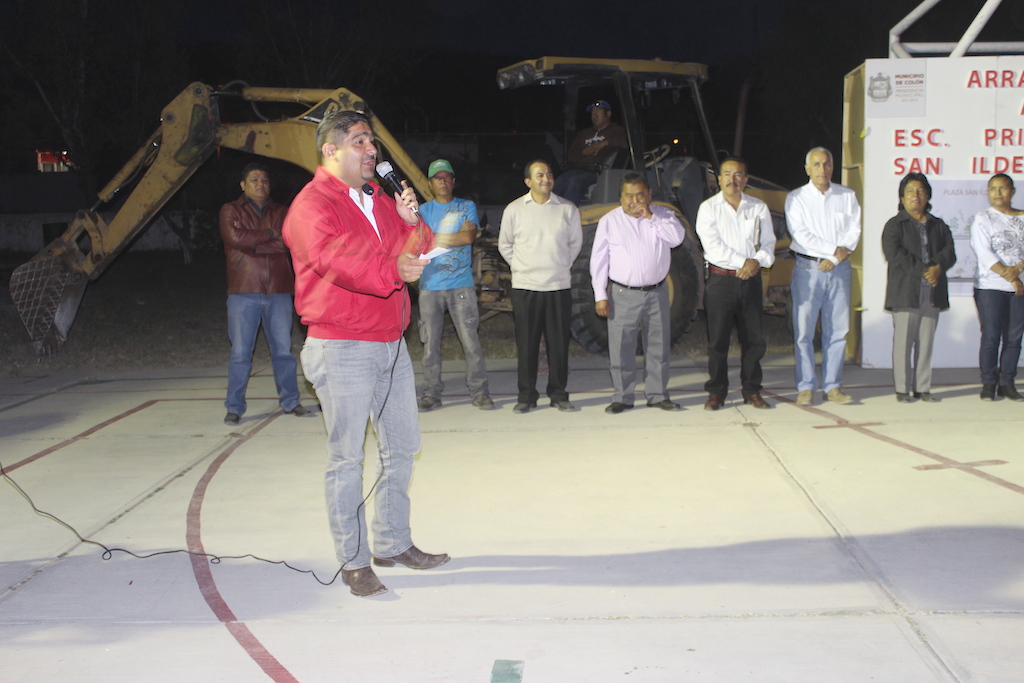 En la comunidad San Ildefonso, el presidente municipal de Colón, Alejandro Arteaga Cabrera, dio inicio a tres obras públicas: la construcción de un arcotecho en la escuela primaria “Niños Héroes”, la pavimentación de la carretera y la colocación de alumbrado en la plaza pública.