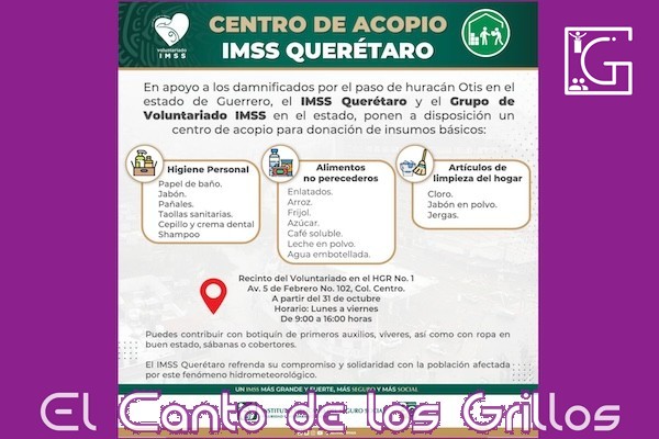 El Instituto Mexicano del Seguro Social (IMSS) junto con el Voluntariado del IMSS en Querétaro pone a disposición de la población un centro de acopio para recolectar insumos que beneficiarán a los afectados por el huracán Otis en el estado de Guerrero.