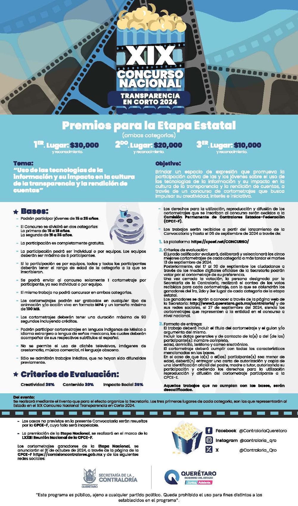 Hasta 30 mil pesos podrán llevarse los ganadores del concurso “Transparencia en Corto” que organiza la Comisión Permanente de Contralores Estados Federación y en Querétaro invita la Secretaría de la Contraloría del Poder Ejecutivo, concurso dirigido a jóvenes de entre 15 y 25 años de edad.
