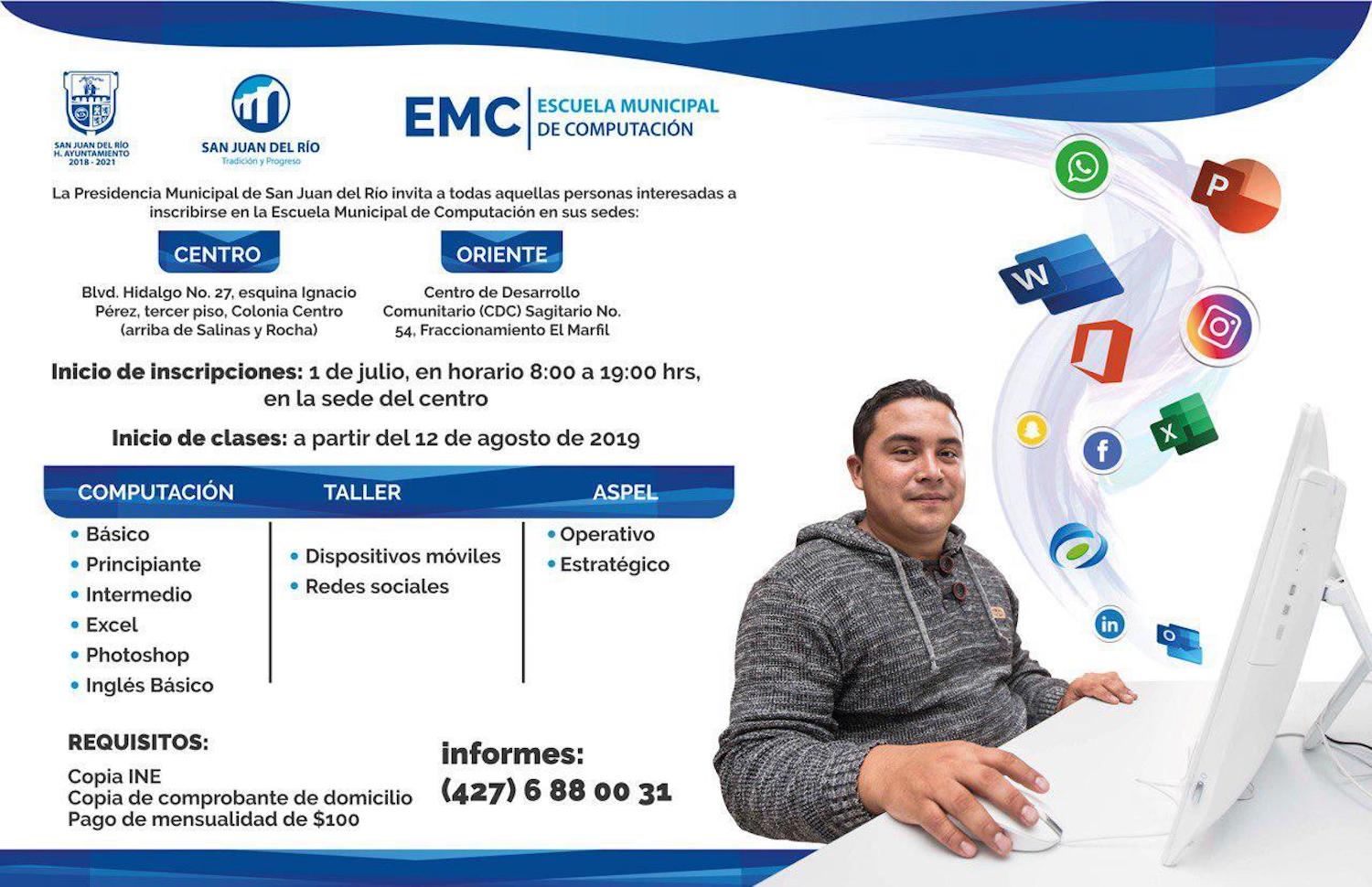 A partir del 1 julio comenzará el periodo de inscripciones al nuevo ciclo escolar de la Escuela Municipal de Computación (EMC), modelo educativo exitoso, único en el estado, promovido por el Gobierno de Memo Vega, que ofrece a la población cursos de computación e inglés básico; además de capacitación para el manejo de programas de edición de imágenes, manejo de dispositivos móviles y redes sociales.