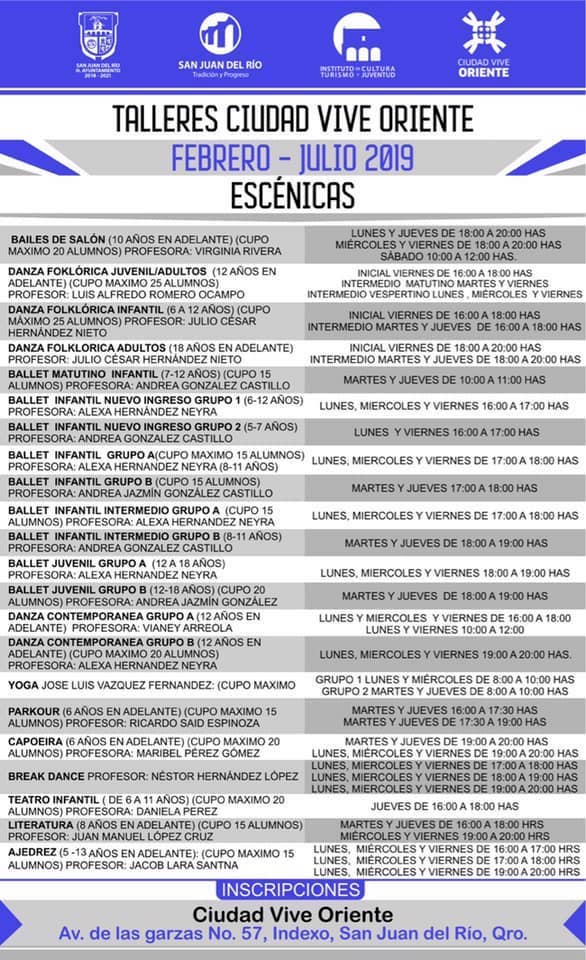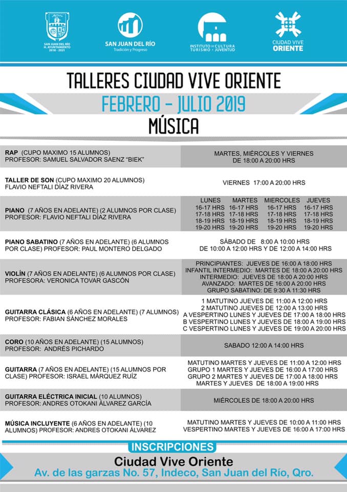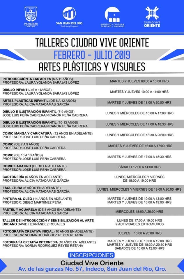 Para que la población sanjuanense se desarrolle en lo cultural y artístico, fomentando valores que promuevan la reconstrucción del tejido social, el gobierno municipal del alcalde Memo Vega, invita a inscribirse a los Talleres Artísticos y Culturales que se impartirán en la Ciudad Vive Oriente, para el Ciclo Febrero-Julio de 2019.
