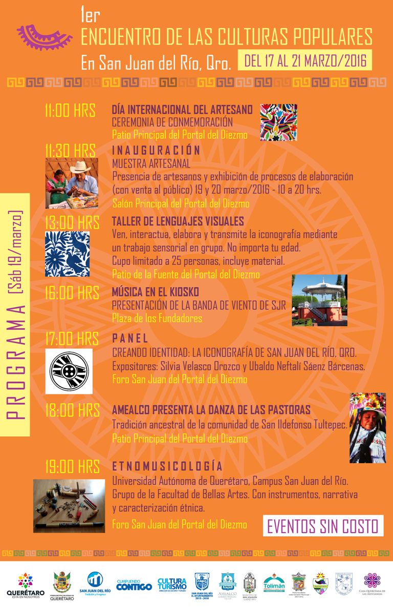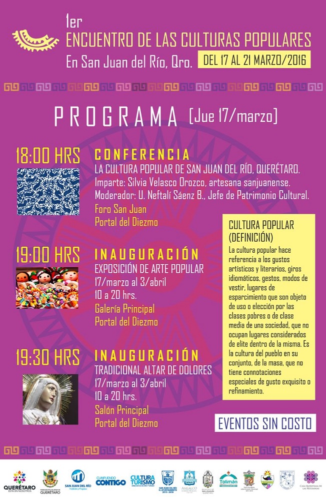 Para el jueves 17 se espera las inauguraciones de la exposición “Arte Popular” y “Altar de Dolores”; el viernes 18, se realizará el taller Lenguajes Visuales y la obra de teatro “La Llama no se extingue”, de la Compañía Queretana de Teatro Indígena; para el sábado 19 se llevará a cabo la conmemoración del Día del Artesano, se inaugurará la Muestra Artesanal y se hará el Panel “Creando Identidad: la iconografía de San Juan del Río”; mientras que para el Domingo 20 se presentarán danzas tradicionales.