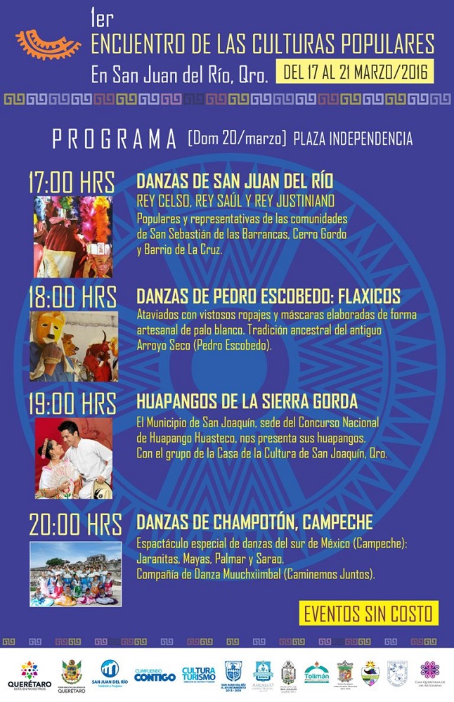 Durante este encuentro, se desarrollarán conferencias, talleres y presentaciones de teatro, música y danzas, destacando la riqueza cultural de San Juan del Río y de otros municipios invitados como: Pedro Escobedo, Amealco, San Joaquín y especialmente Campeche.