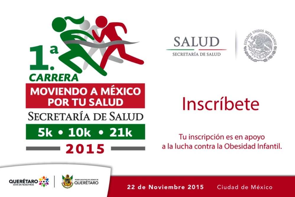 La Secretaría de Salud del Estado de Querétaro invita al público en general a la 1ª Carrera “Moviendo a México por tu salud”; evento organizado por el Gobierno de la República, a través de la Secretaría de Salud Federal, en apoyo a la lucha contra la obesidad infantil.