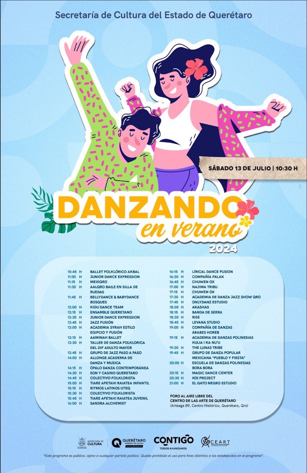 Cabe señalar que el mismo día, también en el Ceart, se llevará a cabo la jornada Danzando en Verano, con la participación de 41 academias, con más de 400 artistas, que se presentarán desde las 10:30 hasta las 21:00 horas en el Foro al Aire Libre del recinto ubicado en José María Arteaga, número 89, en el Centro Histórico de Querétaro; la entrada es libre.