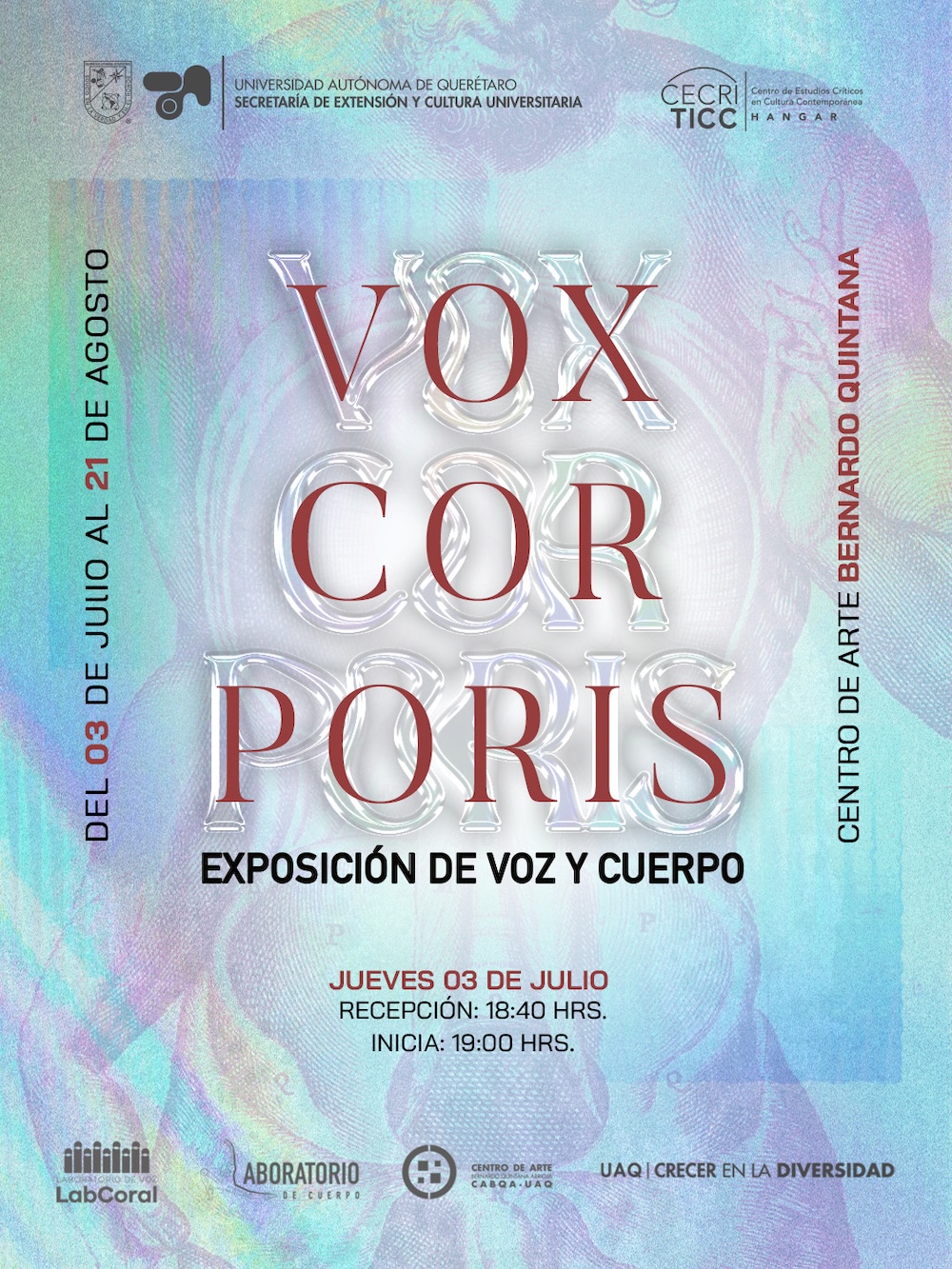 La Universidad Autónoma de Querétaro (UAQ) –por medio de la Secretaría de Extensión y Cultura Universitaria (SECU), a través del Centro de Estudios Críticos en Cultura Contemporánea (Cecriticc), en colaboración con el Centro de Arte Bernardo Quintana Arrioja (CABQA)– invita cordialmente a “Vox Cor Poris. Exposición de voz y cuerpo”, una muestra que es resultado de los procesos creativos y de investigación desarrollados por el Laboratorio del Cuerpo y Laboratorio de la Voz “LabCoral”.