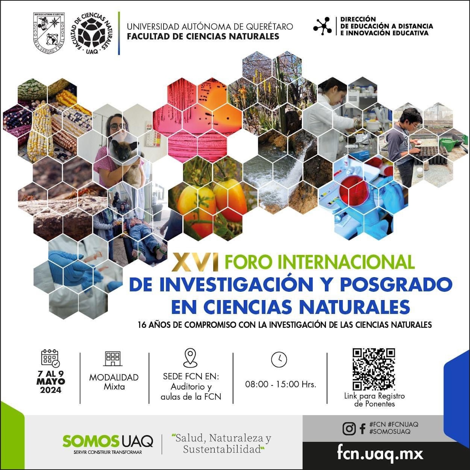 La Universidad Autónoma de Querétaro (UAQ), a través de la Facultad de Ciencias Naturales (FCN), abrió la convocatoria a todos los interesados al 16° Foro Internacional de Investigación y Posgrado en Ciencias Naturales, que tendrá lugar del 7 al 9 de mayo en las instalaciones de la Unidad Académica en campus Juriquilla.