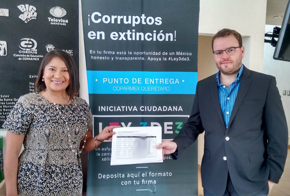 Como lo comprometió, la diputada local por el Distrito I, Daesy Hinojosa Rosas, reunió 500 firmas para impulsar la iniciativa ciudadana 3 de 3 en el Congreso de la Unión. Las rúbricas, concentradas en tres bloques, fueron entregadas el 23 de febrero en Facultad de Ciencias Políticas y Sociales de la Universidad Autónoma de Querétaro (UAQ) y en fechas posteriores (7 y 22 de marzo) en la Confederación Patronal de la República Mexicana (Coparmex) Querétaro; puntos de entrega a la propuesta de Transparencia Mexicana y el Instituto Mexicano para la Competitividad (Imco).