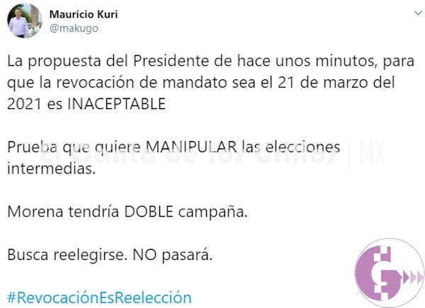 “La propuesta del Presidente de hace unos minutos, para que la revocación de mandato sea el 21 de marzo del 2021 es INACEPTABLE. Prueba que quiere MANIPULAR las elecciones intermedias. Morena tendría DOBLE campaña. Busca reelegirse. NO pasará. #RevocaciónEsReelección”, escribió en su cuenta de Twitter.