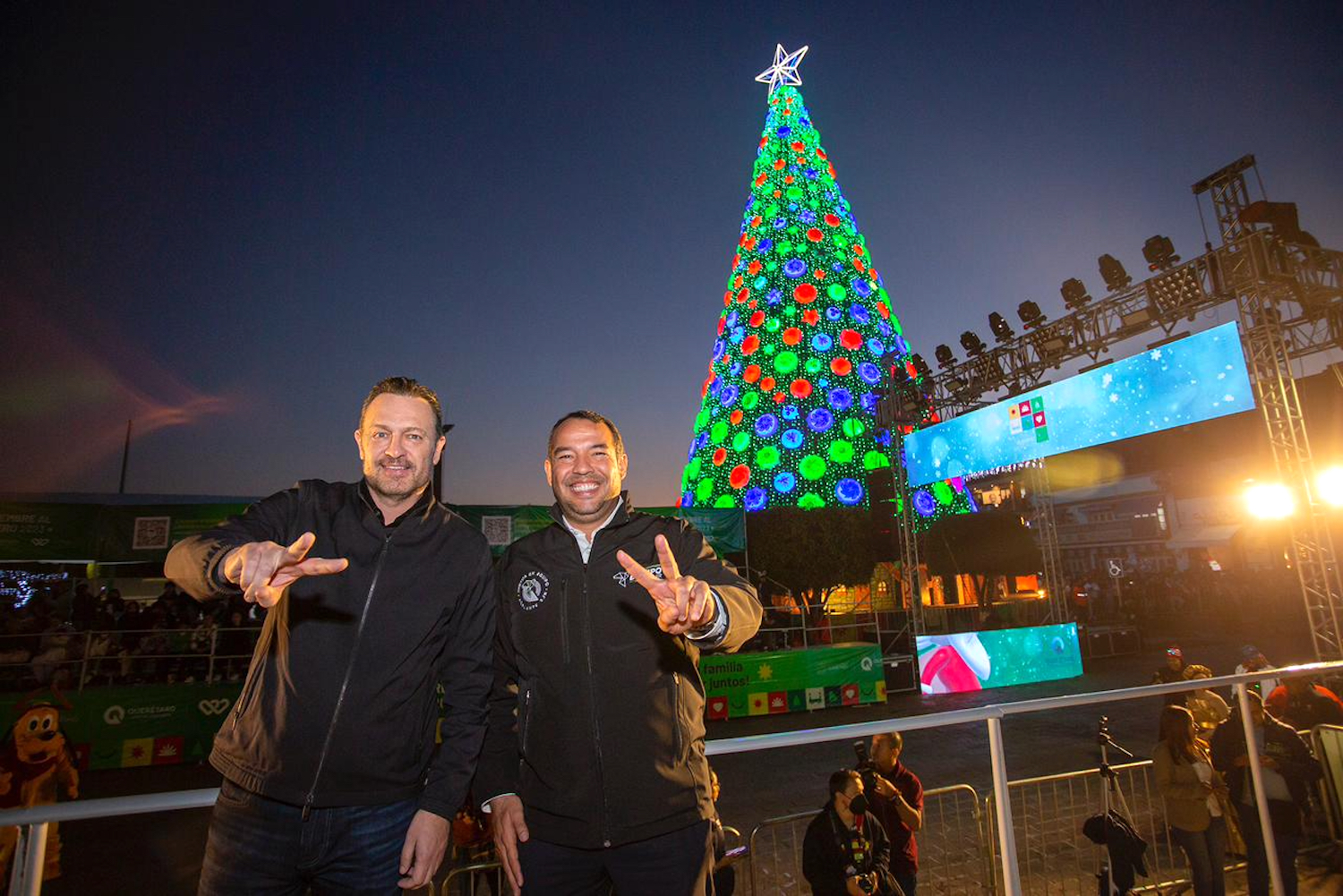 Como parte de las actividades del Festival Alegría 2022 en San Juan del Río, que realizan en equipo los gobiernos estatal y municipal, el gobernador del estado, Mauricio Kuri González, y el presidente municipal, Roberto Cabrera Valencia, presenciaron el Mega Desfile Navideño, que congregó a cerca de 22 mil personas.
