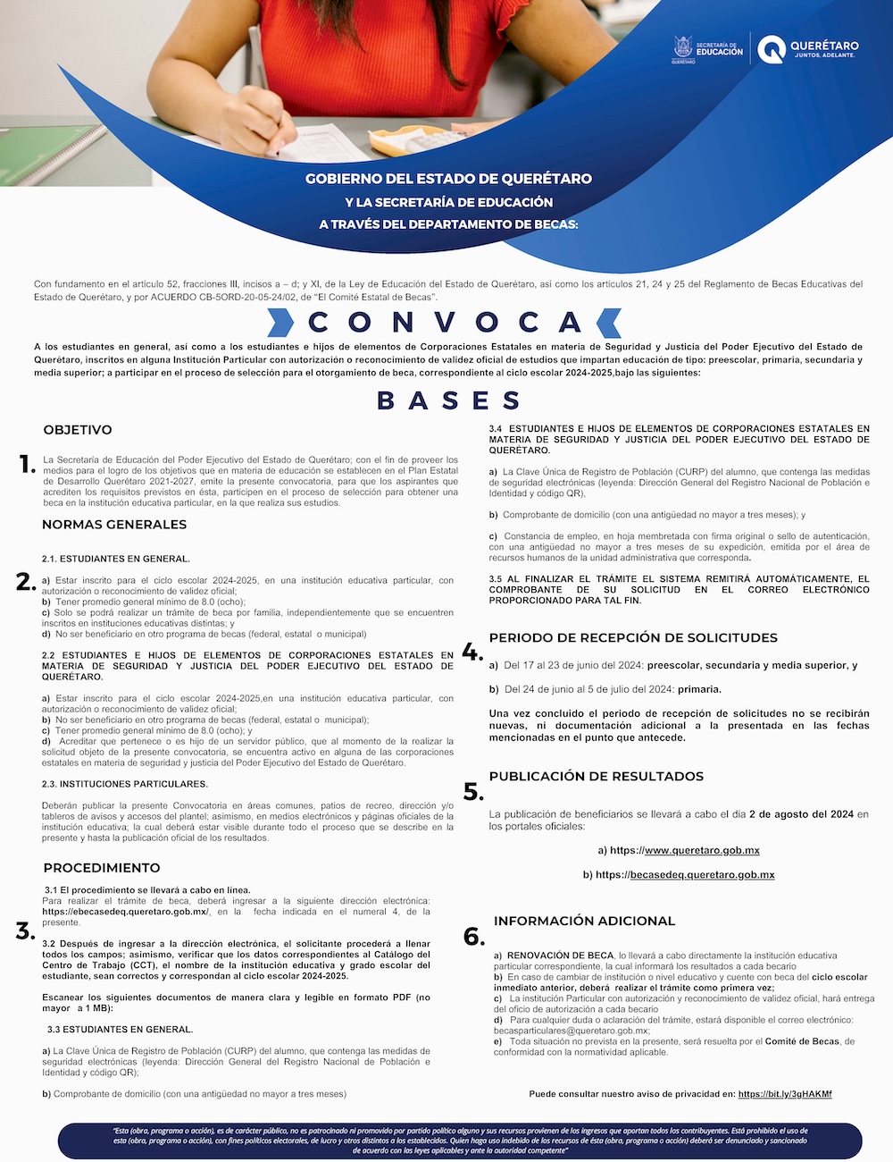A decir de la titular de la Sedeq, Martha Elena Soto, esta oportunidad está abierta tanto para estudiantes en general como para los hijos de elementos de corporaciones estatales en materia de seguridad y justicia del Poder Ejecutivo del Estado de Querétaro. El proceso se realizará completamente en línea, esto a través de la página web: https://ebecasedeq.queretaro.gob.mx/ y sigue las instrucciones para completar tu trámite.