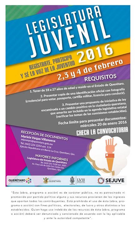 La LVIII Legislatura del Estado de Querétaro y el Poder Ejecutivo del Estado de Querétaro, a través de la Secretaría de la Juventud y el Instituto Mexicano de la Juventud convocan a jóvenes a participar en la “Legislatura Juvenil 2016” y “Casting de radio y televisión Red Poder Joven Qro”, con el objetivo de ofrecer espacios de expresión y fomentar la participación juvenil.