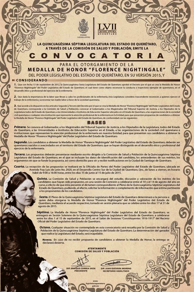 La LVII Legislatura del Estado de Querétaro, a través de la Comisión de Salud y Población, convoca a la sociedad en general a la inscripción de candidatos a recibir las medallas de Honor Florence Nightingale y Doctor Pedro Escobedo; la cual tiene como fecha límite el 15 de julio del presente año.