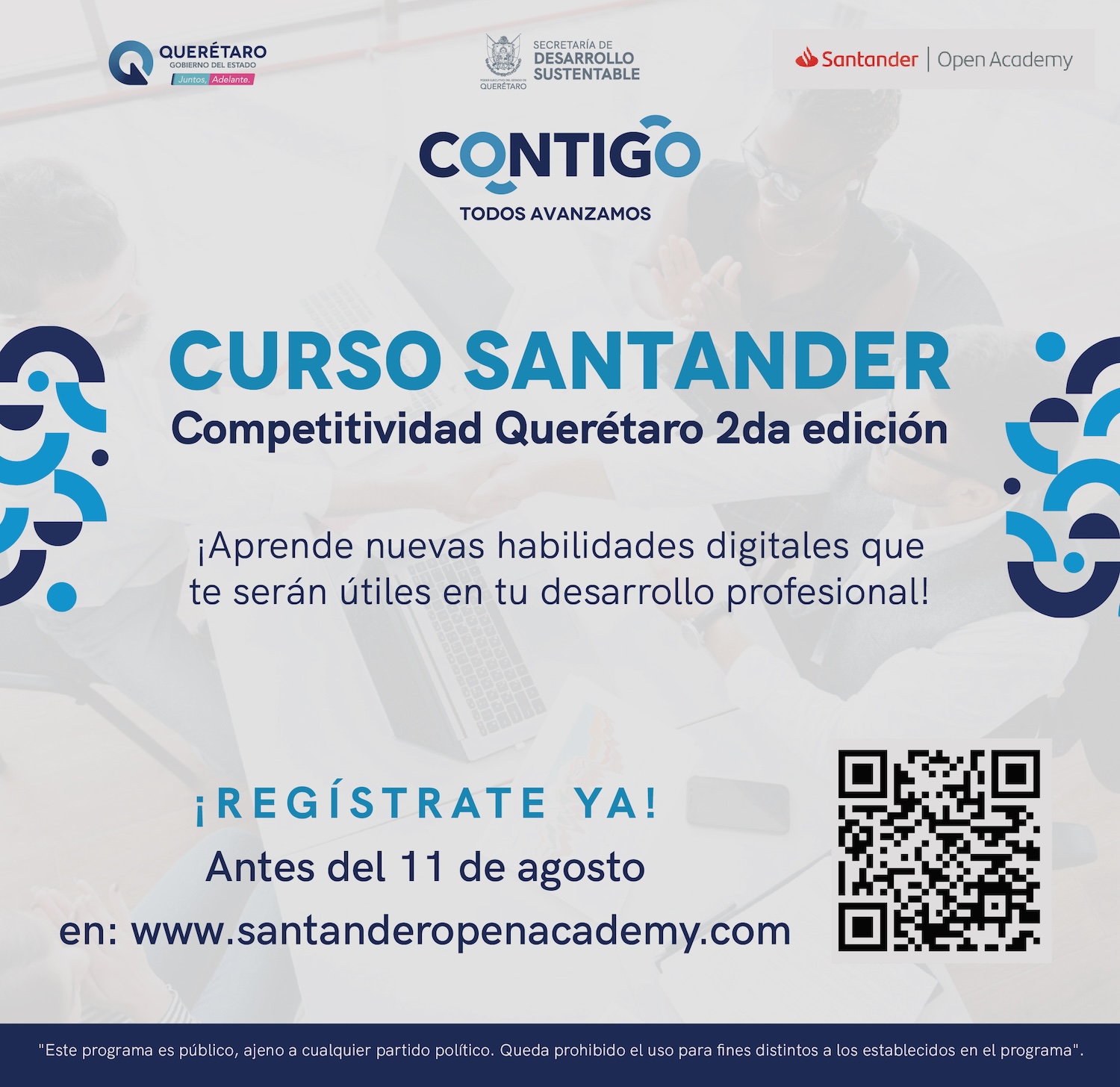 El Poder Ejecutivo del estado de Querétaro, a través de la Secretaría de Desarrollo Sustentable (Sedesu) en conjunto con el Banco Santander, pone a disposición de los queretanos mayores de 18 años, la segunda edición del programa “Curso Santander Competitividad Querétaro”, mediante el cual se ofertan cinco mil becas para formar parte de cursos autogestivos en línea con temas centrados en el futuro del trabajo y las habilidades digitales.