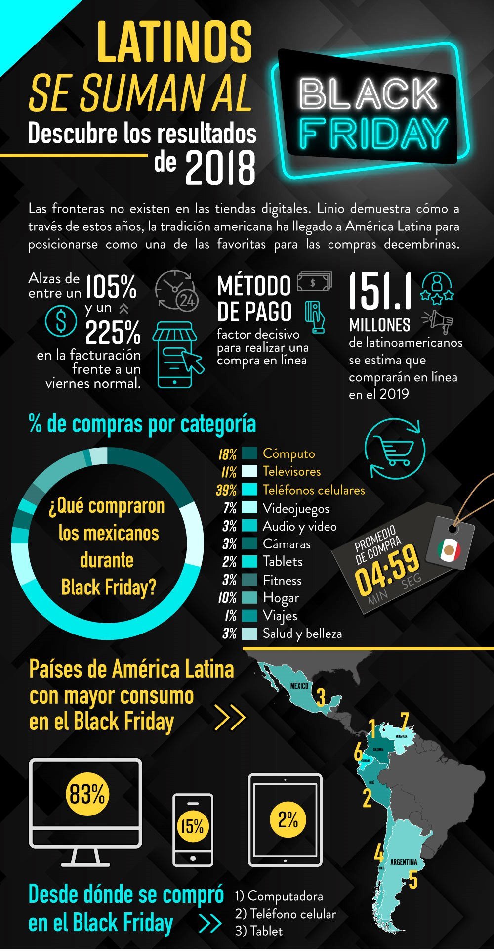La encuesta realizada por Black Friday Global sobre la edición 2017 reflejó que, en toda la región de América Latina, las ventas aumentaron por lo menos un 107% en el Viernes Negro a comparación de cualquier otro viernes del año. Las cifras impactaron realmente en países como Brasil, Chile y Argentina, donde la cifra llegó hasta un 1094% de incremento. En el caso de México, 30.15% de los compradores se inclinaron por tiendas online, mientras que la proyección para 2018 en tiendas físicas era e 27.52%.