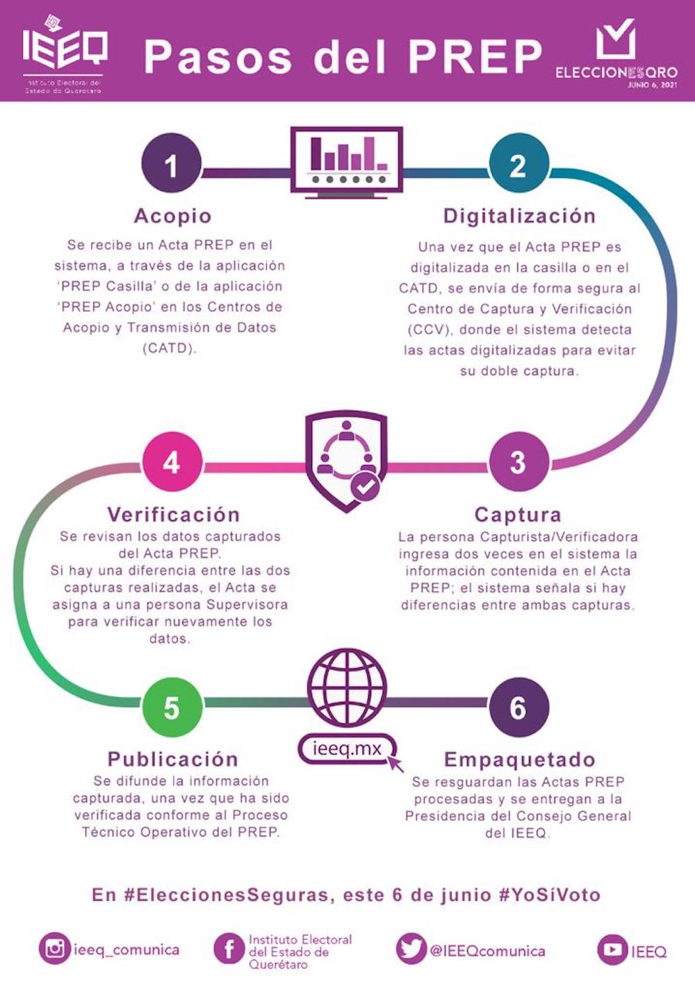 El Programa de Resultados Electorales Preliminares (PREP) del Instituto Electoral del Estado de Querétaro (IEEQ) es un mecanismo confiable, que permite conocer información oficial no definitiva de las elecciones de la gubernatura, las diputaciones locales por el principio de mayoría relativa y los 18 ayuntamientos del estado.